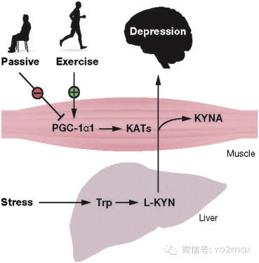 在这项研究中,研究人员证实当给予正常小鼠犬尿氨酸时,它们显示抑郁行为,而肌肉中PGC-1α1水平升高的小鼠则不受影响。事实上,因为在受过良好锻炼的肌肉中KAT酶将犬尿氨酸迅速转化为犬尿酸,引发了一种保护机制,这些动物从不显示血液犬尿氨酸水平增高。