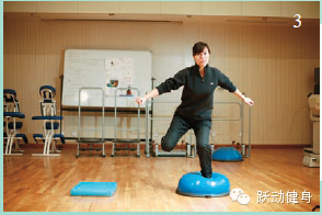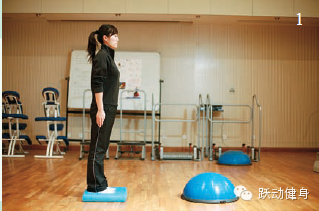 评注:练习前,首先要准确判断垫与BOSU球之间的距离;空中动作要求四肢摆动连贯,下肢用力均匀流畅,避免过度用力影响着立姿位。