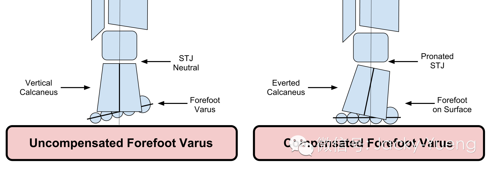 • 就算我们发现足部过度旋前与症状相关联,但其实只是知道足部过度旋前并不能很好的为临床提供治疗的依据,目前更合理的方式是要判断让足部过度旋前的原因,如常常判断足部的形态,前足和后足的形态问题都可以引起足部过度旋前,如下图指示的前足内翻是一个常见引起足部过度旋前的原因,如果患者有这样的问题,我们是需要针对前足去做文章。