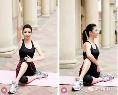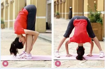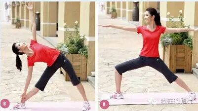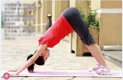 ⑦、单腿背部伸展   坐式,左脚至于右侧大腿内侧,右侧脚回勾,上身前屈双手抓右脚。换另一侧进行。膝盖骨要上提,大腿肌肉始终绷紧。  ⑧、三角式 站立,双脚分开与肩同宽,双手侧平举,然后弯腰,眼看上方指尖。反侧同样。膝盖伸直的同时保证重心上提。  ⑨、战士式 站立,双脚分开与肩同宽,双手侧平举,右腿屈膝下沉,大腿与地面平行,眼看右手指尖。左脚外侧用力下压,上身摆正。⑩、站立前屈  双脚分开,下腰,双手尽量去握双脚的脚踝,让自己的头顶去找脚尖。腿伸直肩颈拉长。⑪、下犬式  四肢着陆,两腿并拢伸直,脚跟尽量下踩,拉长手臂手心贴地十指张开。颈部肌肉一定要放松。[size=1em]↑[size=1em]⑫、双脚式 双脚分开站立,脚尖指向正前方,上身前屈,双手放于双脚内平行线的延长线上。重心放于双脚掌间,让颈部得到拉伸。