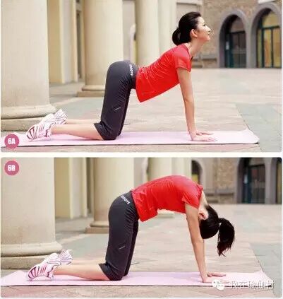 俯卧,双手双脚与肩同宽,吸气时腰部下沉,臀部头部向上,呼气时背部向上,臀部颈部收回。手臂一直伸直,注意呼吸的配合。