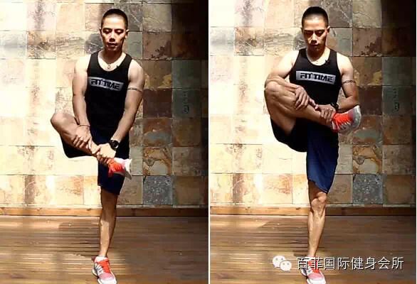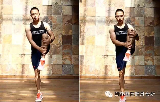 1.保持站姿,手握住踝关节,将脚后跟拉近臀部;