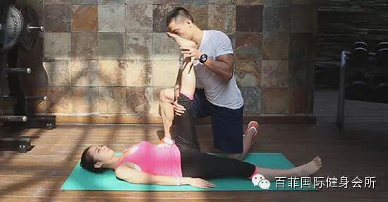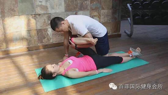 1.搭档仰卧垫子上,一侧腿抬起,手臂从下侧绕过,抓住她的膝盖,用自己脚腕压住她另一侧腿(防止她另一侧脚弹起),到位后轻轻下压;