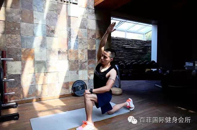 1.双腿交叉,重心在前侧腿,后腿踩实,收紧下背,适当向前俯身,身体前倾的时候腰部肌肉收紧;