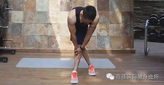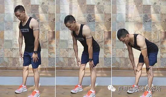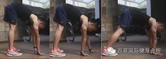 1.双腿站距与肩同宽,下背收紧,向下俯身;