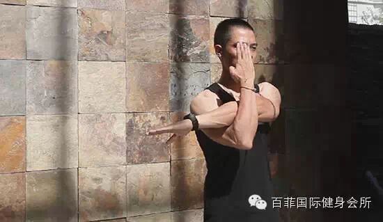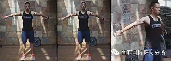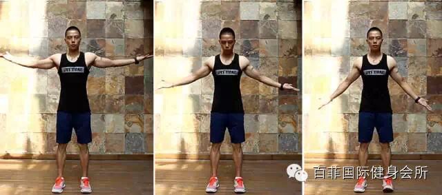 2.掌心朝上,手臂端平,手臂打开后将整个胸廓向外打开然后还原,在上中下三个方向上激活胸部不同位置的肌肉;