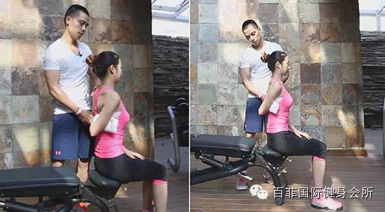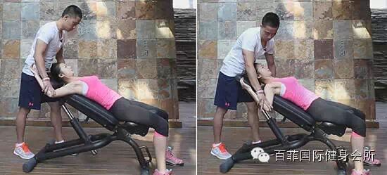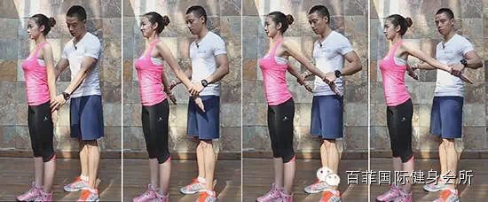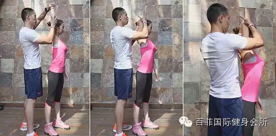 2.搭档原地站立,双手叉腰,保持沉肩,收腹,轻轻推她的双手向内,由轻到重,她的整个肩部保持中立位,不要向前倾;