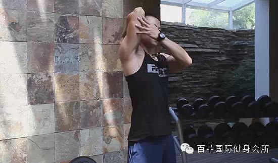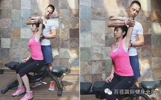 2.训练搭档原地站立,单臂抬起,托住她整个肘关节,轻轻向后弯压,手肘贴近整个头部;