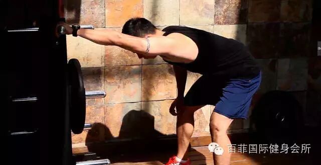 1.单臂抓住固定物,双腿打开,站距与肩同宽,臀部向后坐,手臂伸直;