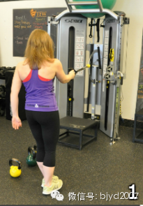 单腿硬拉的训练还可以通过无轨迹训练器(Cable Machine)完成。站在无轨迹训练器前1.5米左右,不同的站立位阻力矢量的方向不同,而不管身体与阻力绳的角度是什么,硬拉完成时身体的姿态是一样的,所以在硬拉起身的过程中髋是有一定的扭转的,因此有一定的扭矩存在(torque),所以对伸髋的力量与控制能力的要求也增强了很多。