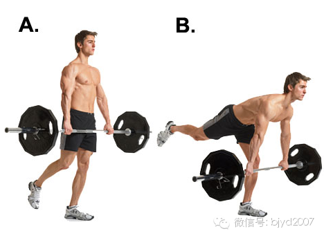 相信你可以猜到,双腿硬拉也不是最有效的髋部训练方式,最佳的还是单腿硬拉(Single Leg Deadlift)。因为我们说功能训练的关键词一个是Uni-(单侧),另一个是Anti-(抗拒)也就是控制。在竞技体育中,单侧发力的运动很多,而在体能训练中,单侧训练的份额又很少,使得运动员不能充分发展单侧力量。而单侧训练本身也是一种“抗拒”训练(抗拒摔倒),如果再加上足够的外界负荷,就更可以模拟真实比赛中“抗拒”外界作用力的现象(无论作用力来自于外物还是来自于对手)。所以单腿硬拉时可以把精力集中在一条腿上,使力量训练更加充分,且单腿站立对平衡的要求更高,进而更好的训练了控制能力,能让身体更多的“抗拒”不必要的晃动。