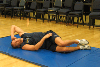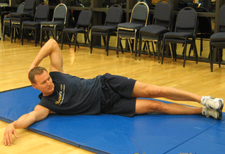【老朋友】点击右上角分享,关注公众微信号worldspine 【更多资讯】打开世脊联公众平台,点右上角查看历史记录 腰两侧的脂肪是人体最容易堆积脂肪的部位之一。特别是30岁左右的男女,腹部两侧赘肉就开始下沉并显露出来。 那么有什么好方法能够减少腹部两侧的赘肉呢? 这里建议多加强有氧运动和多锻炼腹部两侧肌肉。有氧运动就不多说了,可以选择每次至少30分钟以上的跑步、跳绳、游泳、骑车等。 这里重点来讲解怎样锻炼腹部两侧肌肉,从而提高腹部两侧肌肉质量以及消耗腹部两侧的脂肪。 动作1:侧卧半身起,双脚屈膝