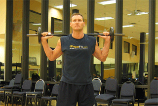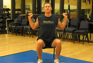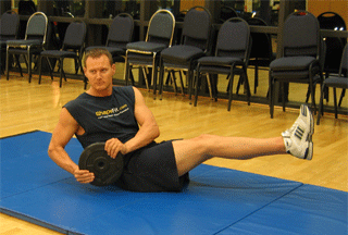 动作4:坐姿双手握杠铃片转体,双脚伸直腾空