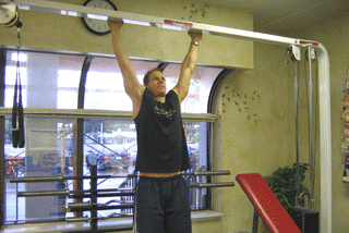 动作 2:单杠悬垂,双脚并拢体侧收膝
